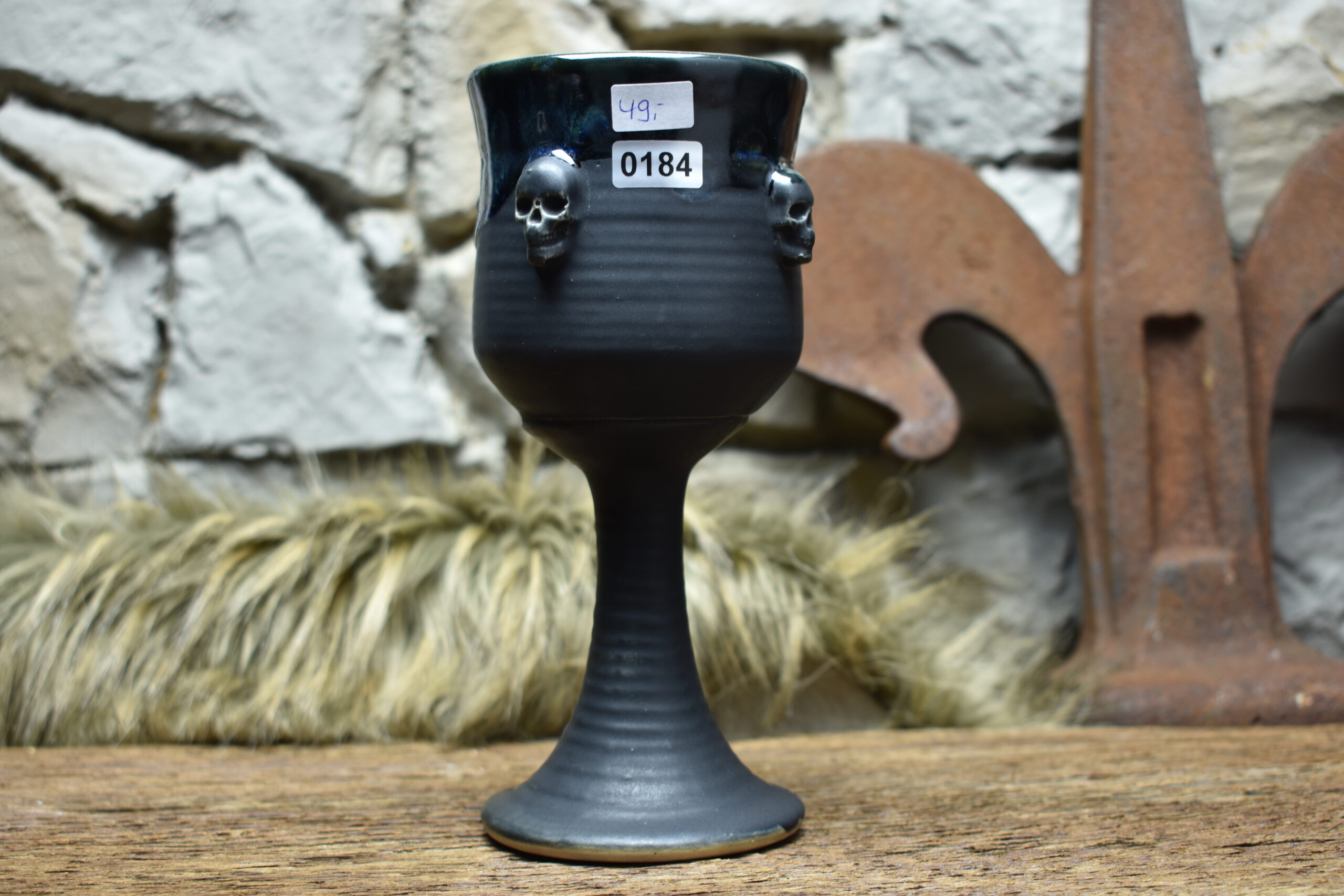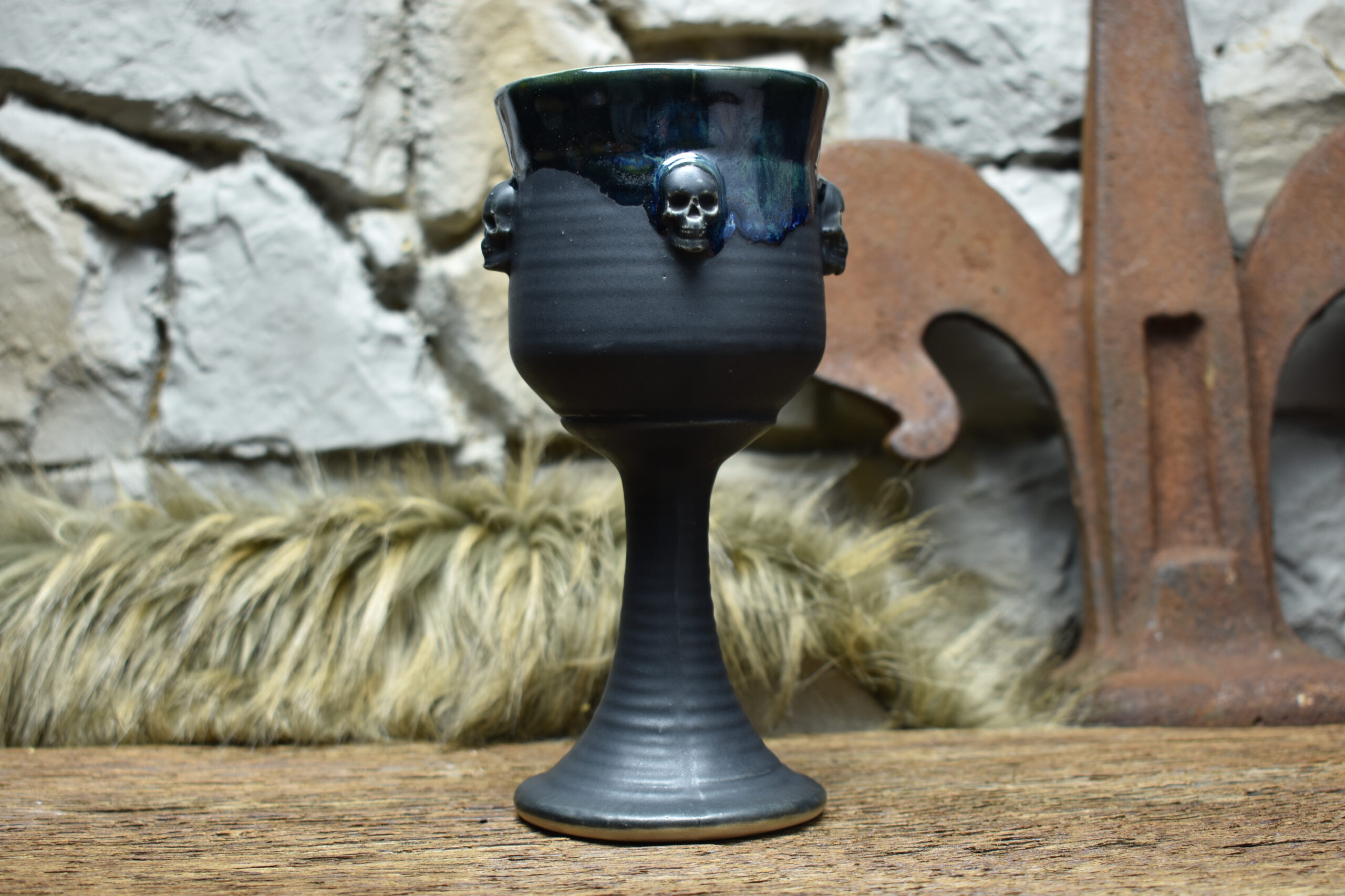 Handmade ceramic wine goblet with skulls – matt black and effect glaze 3