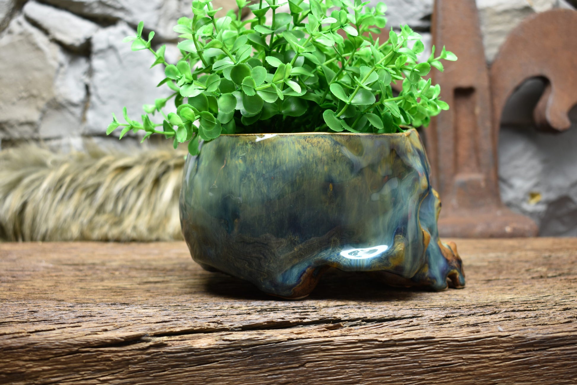 Medium size skull plantpot blue/green/brown effect glaze
