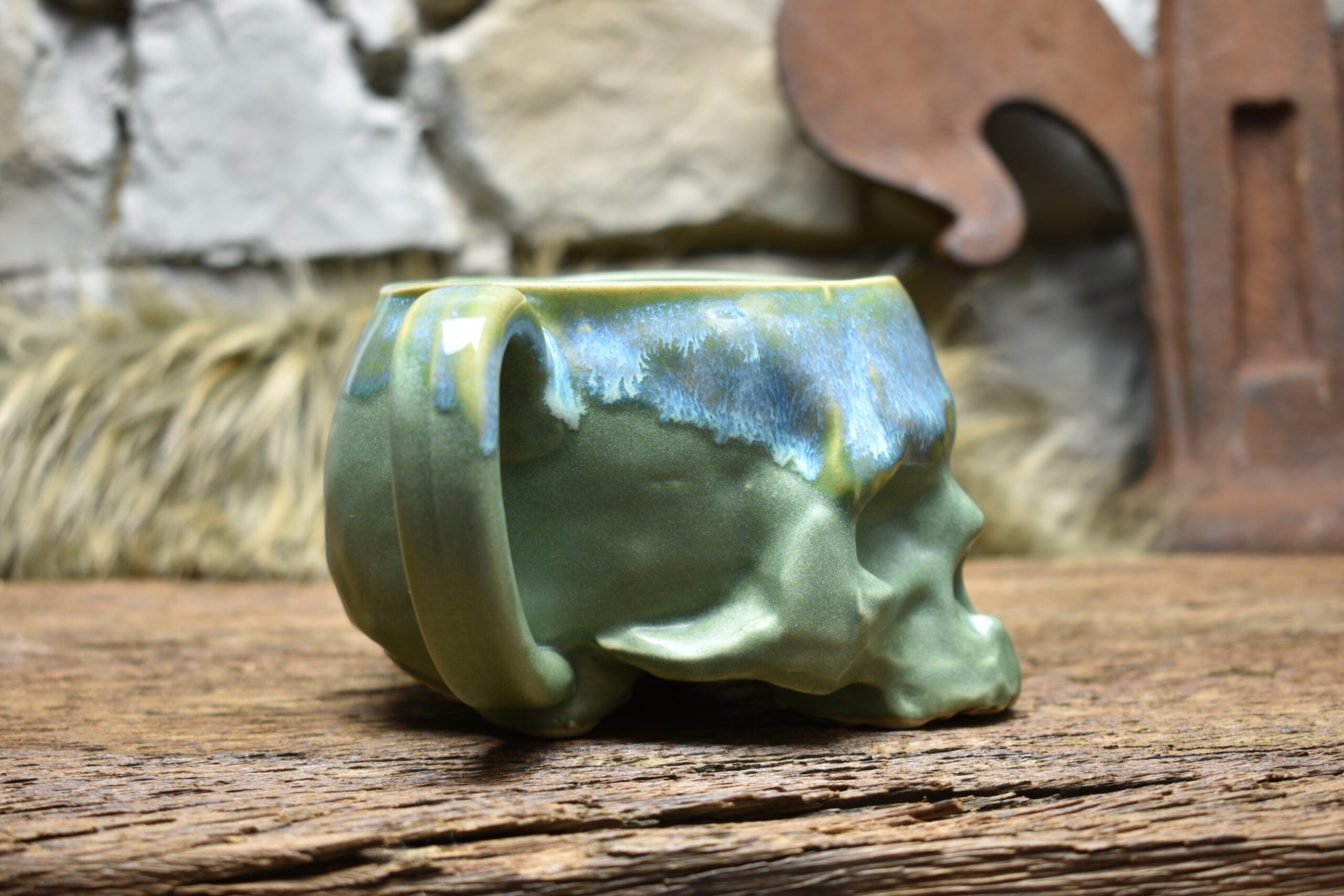 Skull mug green matt and blue effect glaze 2